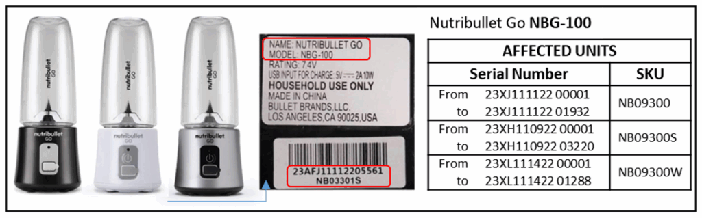 As a precautionary measure, Nutribullet launched a voluntary corrective action regarding specific units of the rechargeable blender “Nutribullet Go” model NBG-100.Only units with the following serial numbers and the accompanying SKU numbers as shown in the table below are potentially affected.You can easily identify if your blender is affected by checking the serial number and the accompanying SKU number shown on the rating label underside the motor base of the blender (see illustration below):